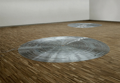 The tubing is arranged in a spiral form. Inside the tubes flows water intermitted by air-bubbles. In one of the spirals the water is moving clockwise, in the other spiral it is moving counter-clockwise, . The movement in both spirals is directed from the periphery to the center, so a visual maelstroem is created, so both spirals seem to move and create an uncertain terrain for the observer.
