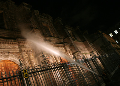 The action was produced during the opening of the V Sound Art Festival of Mexico curated by Taiyana Pimentel confronting values of fragility, cleaning, deterioration and historical references of the barroque facade of the Museum with dependence of the National Institute of Anthropology and History of Mexico.
